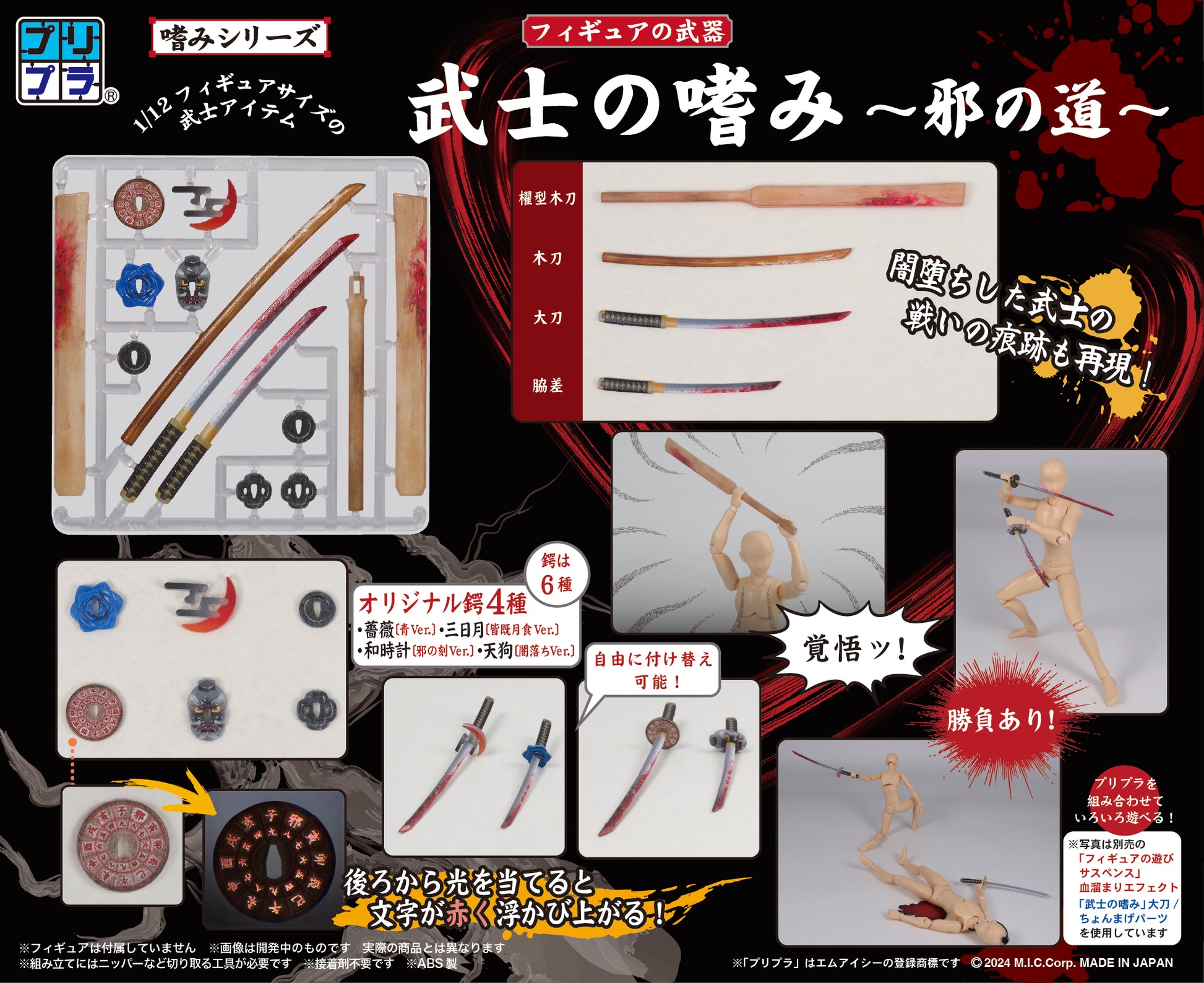 - 大刀、脇差、木刀、櫂型木刀、通常鍔2種(丸形、小判型)、 オリジナル鍔4種(薔薇 青Ver.、三日月 皆既月食Ver.、和時計 邪の刻Ver.、天狗 闇落ちVer.)
