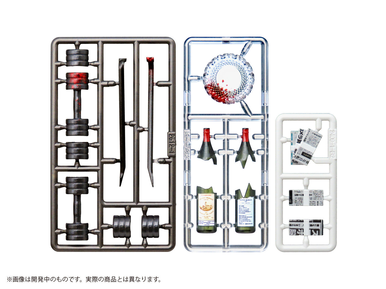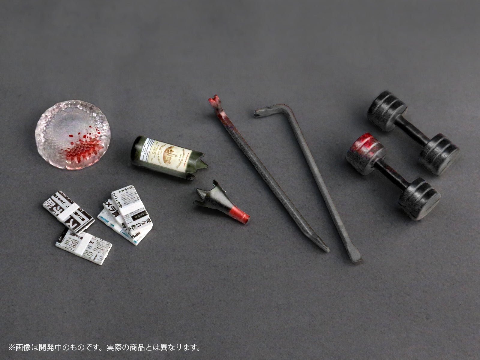 ワインボトル、灰皿(ウェザリングカラー)、偽札束(新聞紙)、 バール2種(通常/ウェザリングカラー)×各1、ダンベル2種(通常/ウェザリングカラー)×各1